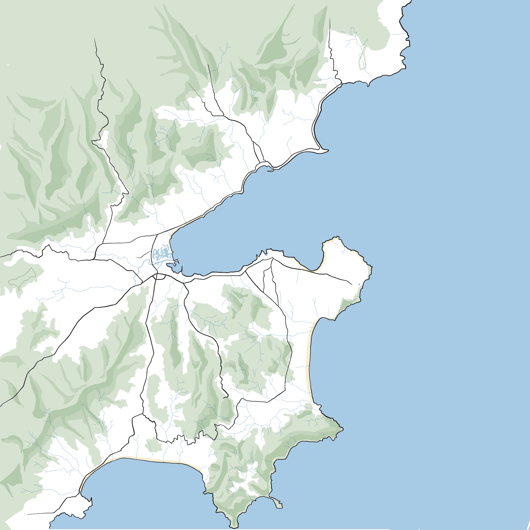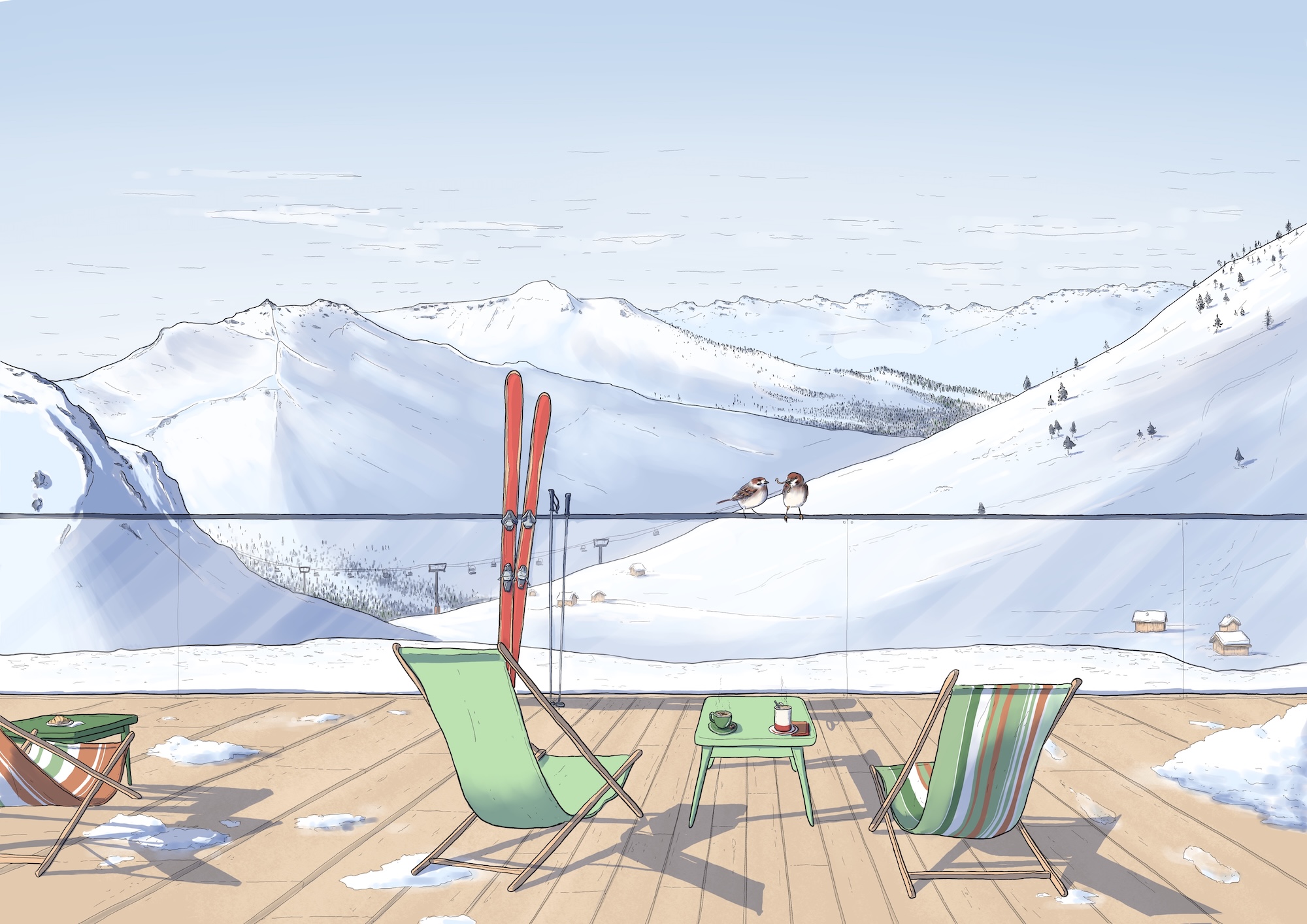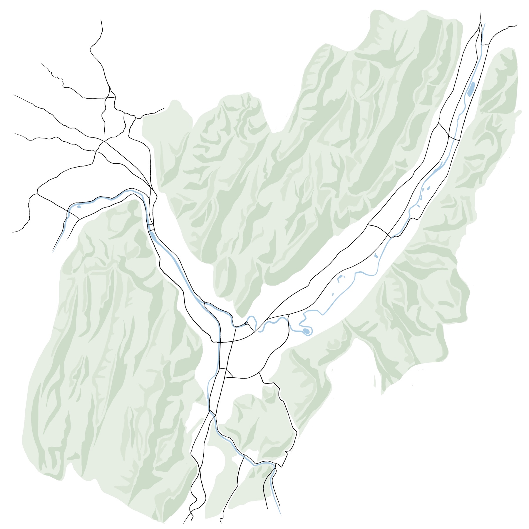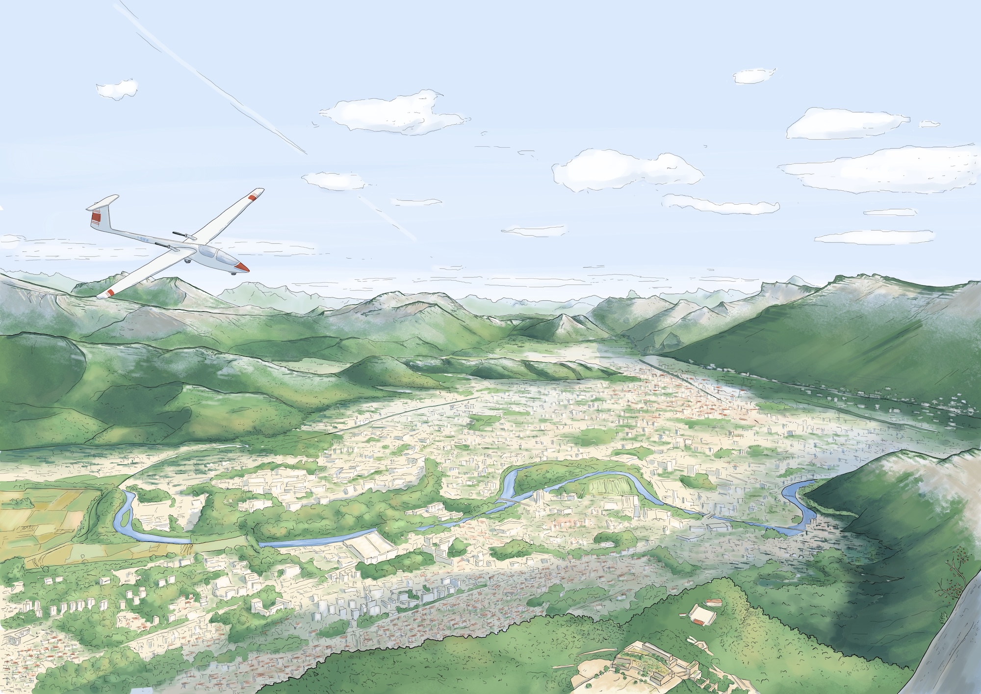 3 illustrations d’ambiance des régions d’intervention de l’Atelier Gröll, accompagnées de leur cartes géographiques.